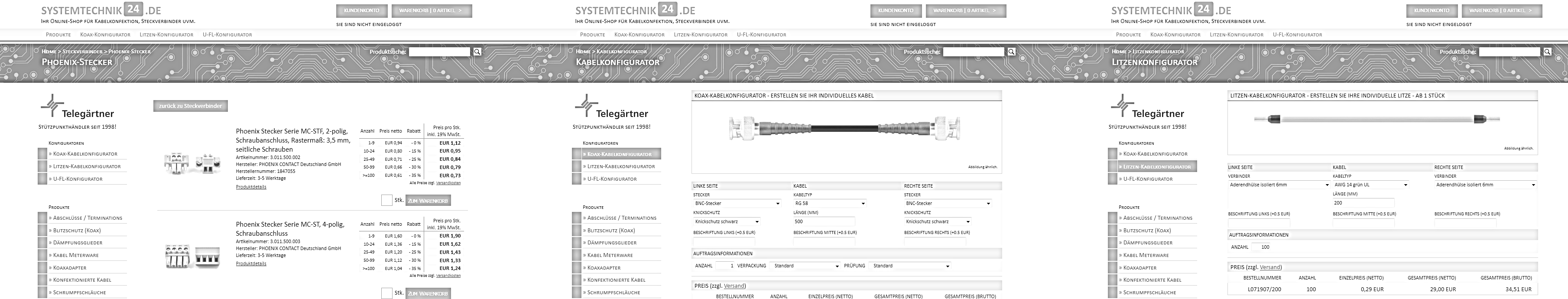 Bereits mehr als 1400 Artikel online gro�e Auswahl an Produkten von -Teleg�rtner -Phoenix zus�tzlich erhalten Sie -Steckverbinder (Koax, Litzenverbinder, Flachbandverbinder) -Koaxkomponenten (Adapter, Terminations, Blitzschutz) -Kabel Meterware -Schrumpfschl�uche zu den Shop-Artikeln... |